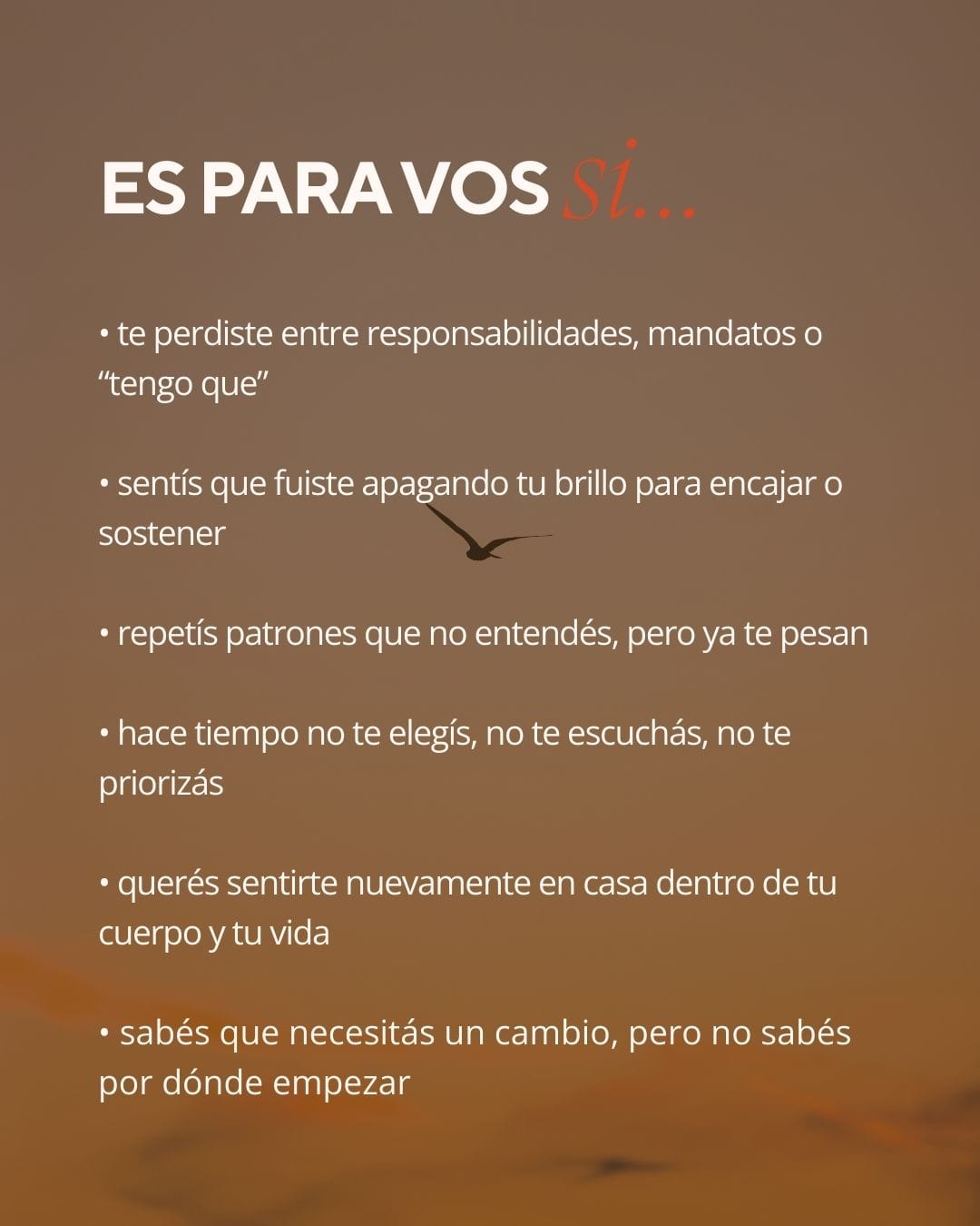Este programa es para vos si te cuesta sostenerte, repetís patrones o anhelás una transformación real. Te acompaño a frenar, mirar con amor lo que duele y sanar desde la raíz para reconectar con tu versión más auténtica.