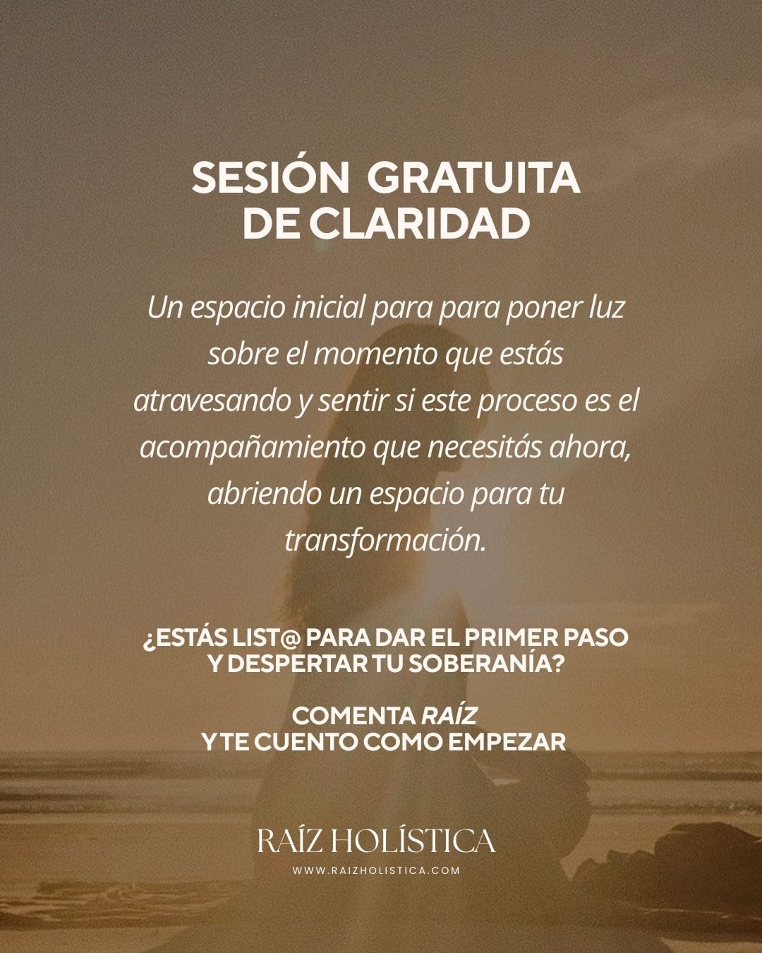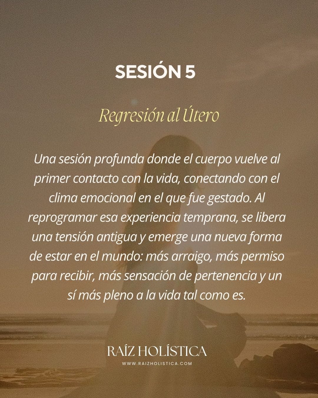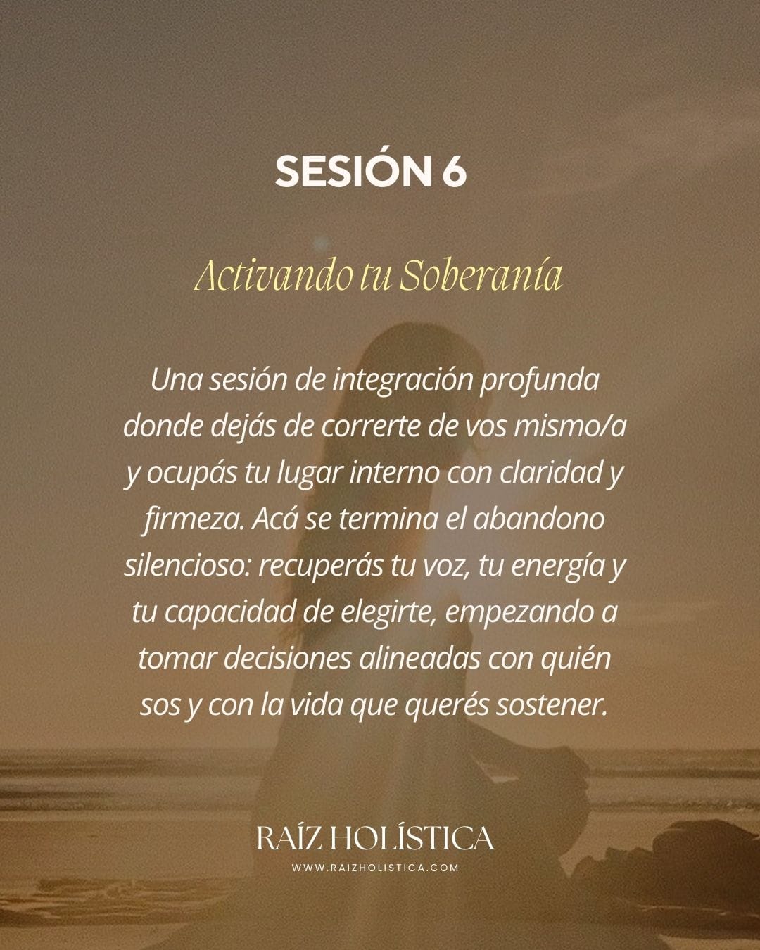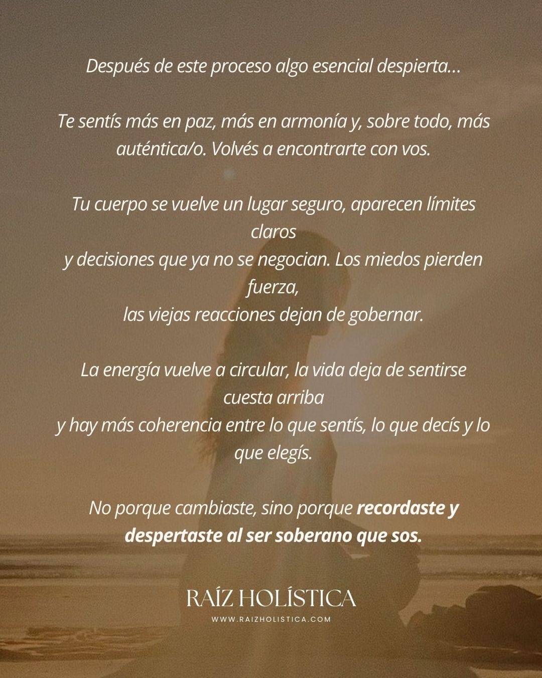 Desde Raíz es un proceso individual, profundo y amoroso diseñado para ayudarte a reencontrarte, recuperar tu poder personal y volver a habitar tu vida desde plenitud, claridad y soberanía interna.