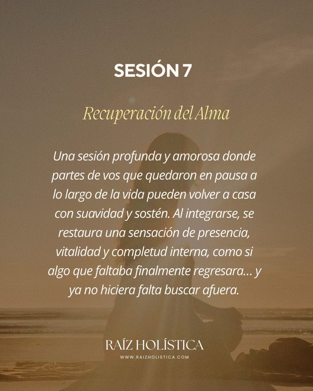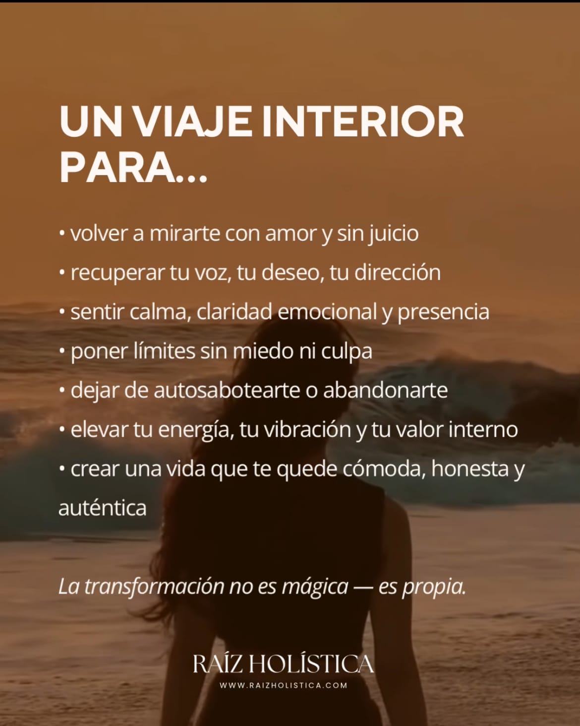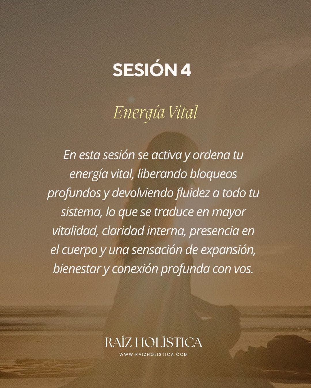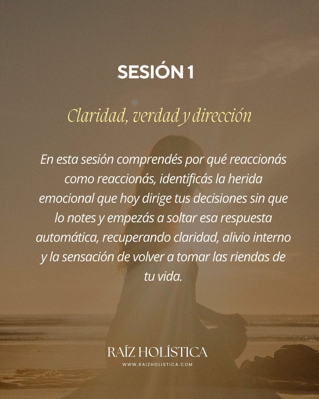 Desde Raíz es un proceso individual, profundo y amoroso diseñado para ayudarte a reencontrarte, recuperar tu poder personal y volver a habitar tu vida desde plenitud, claridad y soberanía interna.